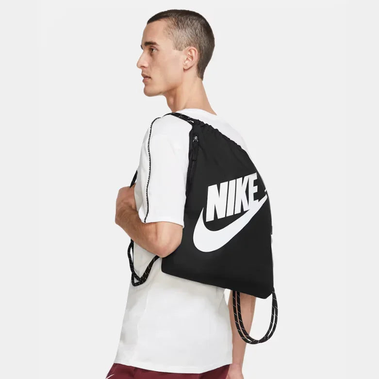 The Nike Heritage Drawstring Bag is a lightweight and practical bag for daily use or sports. Made from durable fabric, it features a roomy main compartment with a simple drawstring closure for quick access. The drawstring straps double as shoulder straps for easy carrying. Finished with the Nike logo, this bag is perfect for gym, training, or casual outings.