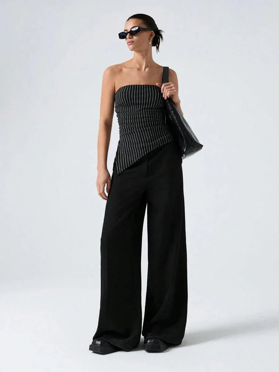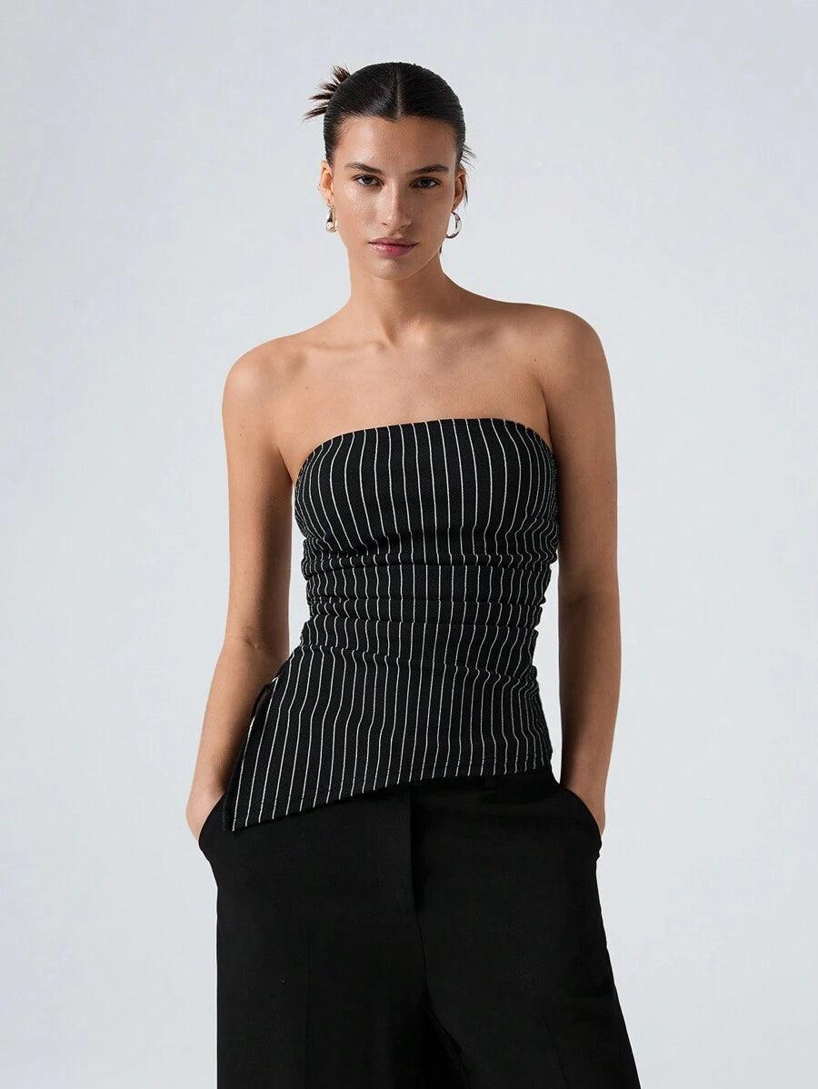 This Black Asymmetrical Striped Cropped Top combines style and comfort with its trendy design. Featuring a strapless neckline, drawstring detail, and lettuce trim, it has a slim fit and an asymmetrical hem that adds a unique touch. Made from non-stretch woven fabric with 98% polyester and 2% elastane, it provides a sleek, structured look. The top is unlined, not sheer, and perfect for casual outings or as a stylish addition to your wardrobe. Machine washable or professional dry clean for easy care. Ideal for pairing with high-waisted pants or skirts for a chic, everyday look.