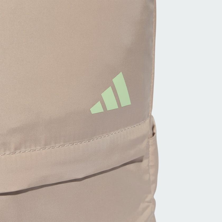 The Adidas Yoga Backpack in beige is a versatile and eco-friendly choice for your active lifestyle. Crafted from 100% recycled polyester, it offers a spacious 25.75-liter capacity to accommodate your gear, laptop, water bottle, and other essentials. The backpack features a zippered main compartment, a front zip pocket, and side slip-in pockets for organized storage. An integrated strap allows you to securely attach your yoga mat, while ergonomic shoulder straps and a mesh back panel ensure comfortable carrying. Its sleek design makes it suitable for both gym sessions and daily commutes